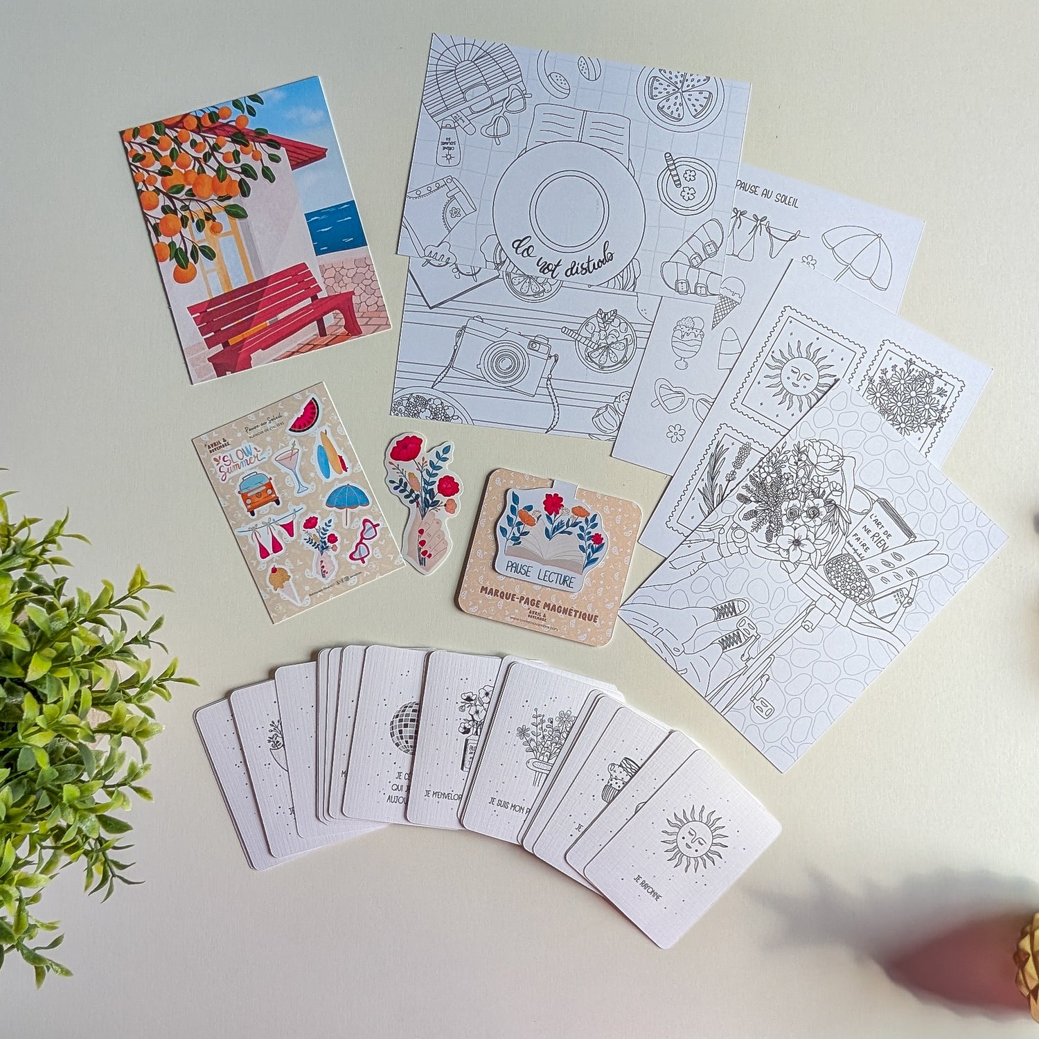 Ce kit “Pause au Soleil” est une douce invitation à ralentir, souffler et savourer l’instant. Pensé comme un concentré de bien-être illustré, il vous accompagne dans vos moments de lecture, d’écriture ou de rêverie.