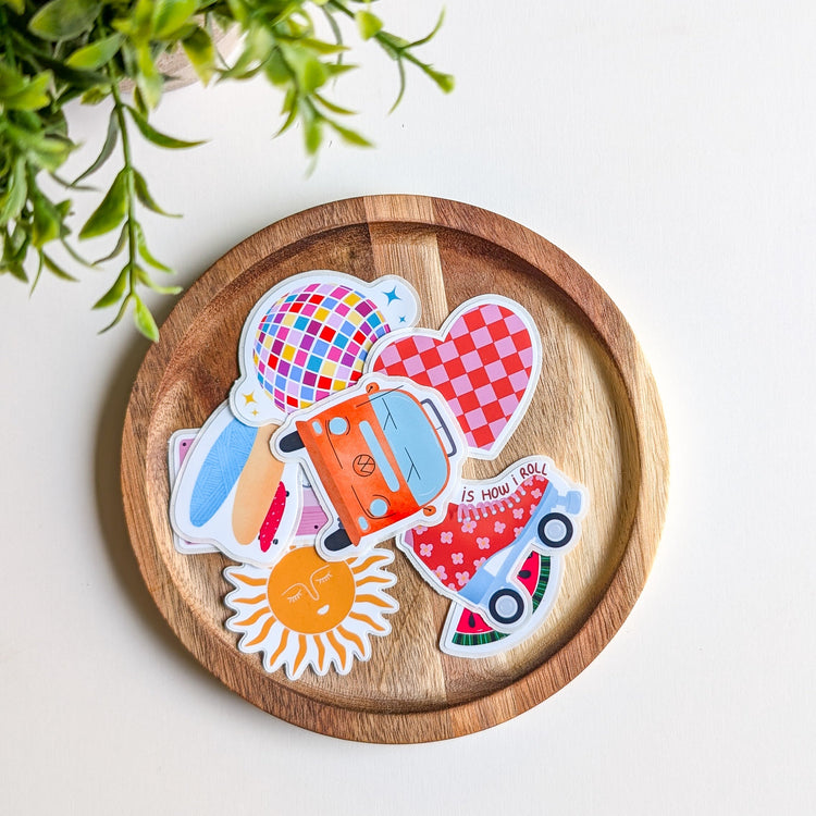 Retour dans les années vintage avec notre collection de stickers Rétro & Fun : boule à facettes, roller, cassette 90’s et autres designs graphiques et pétillants.