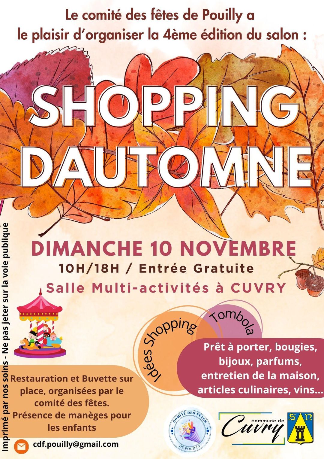 Ce dimanche 10 novembre, ne manquez pas le Salon Shopping d’Automne à Cuvry ! Une occasion parfaite pour démarrer vos achats de Noël ou pour trouver de petits trésors qui vous feront plaisir.Des exposants variés, des idées cadeaux et une ambiance festive… Venez passer un moment agréable et dénicher de belles surprises pour vos proches ou pour vous-même !