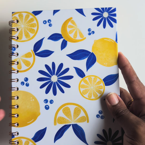 Ce carnet plein de peps mêle citrons jaunes et feuillage bleu sur une couverture rigide douce au toucher. Il est conçu pour mettre de la lumière dans les journées, une page à la fois.