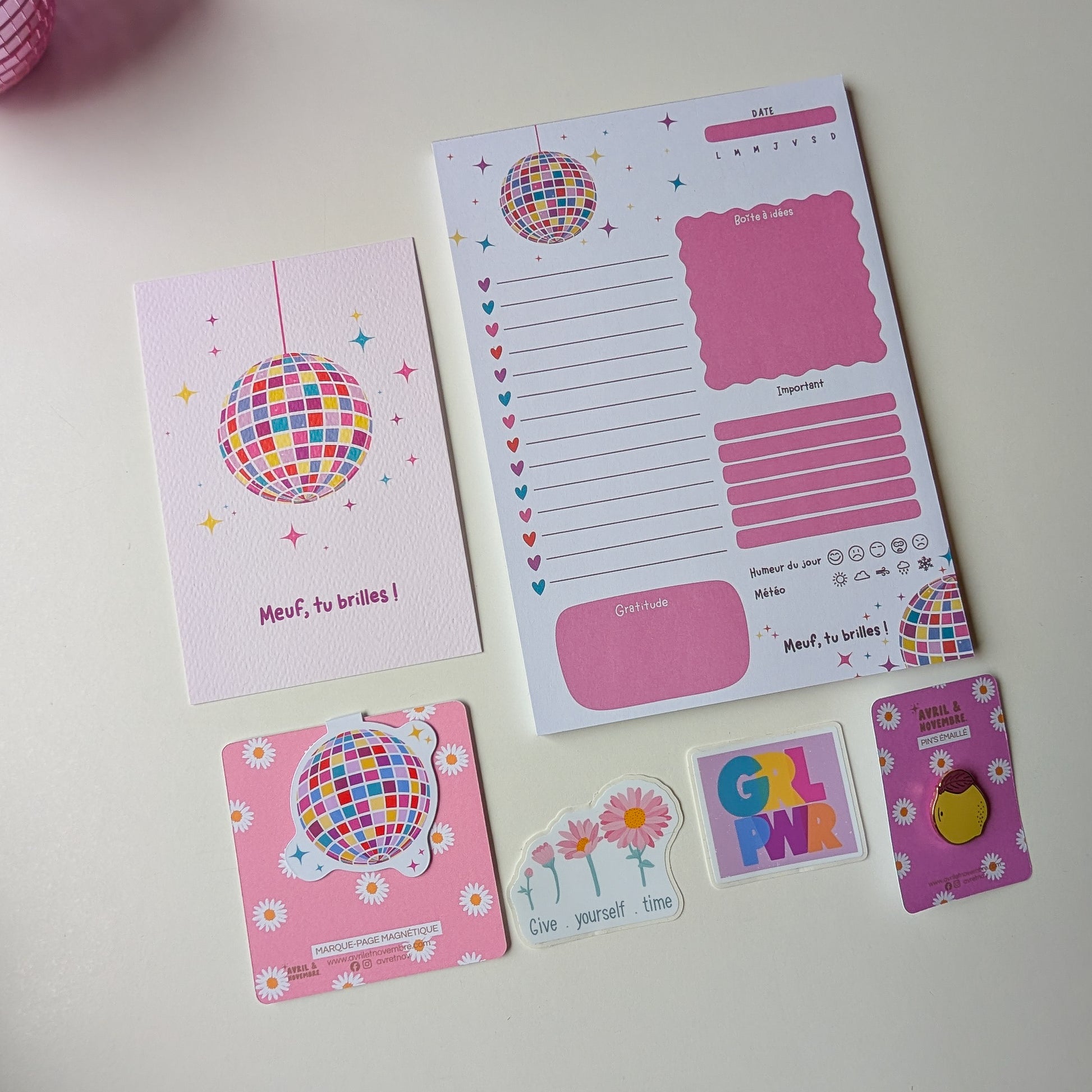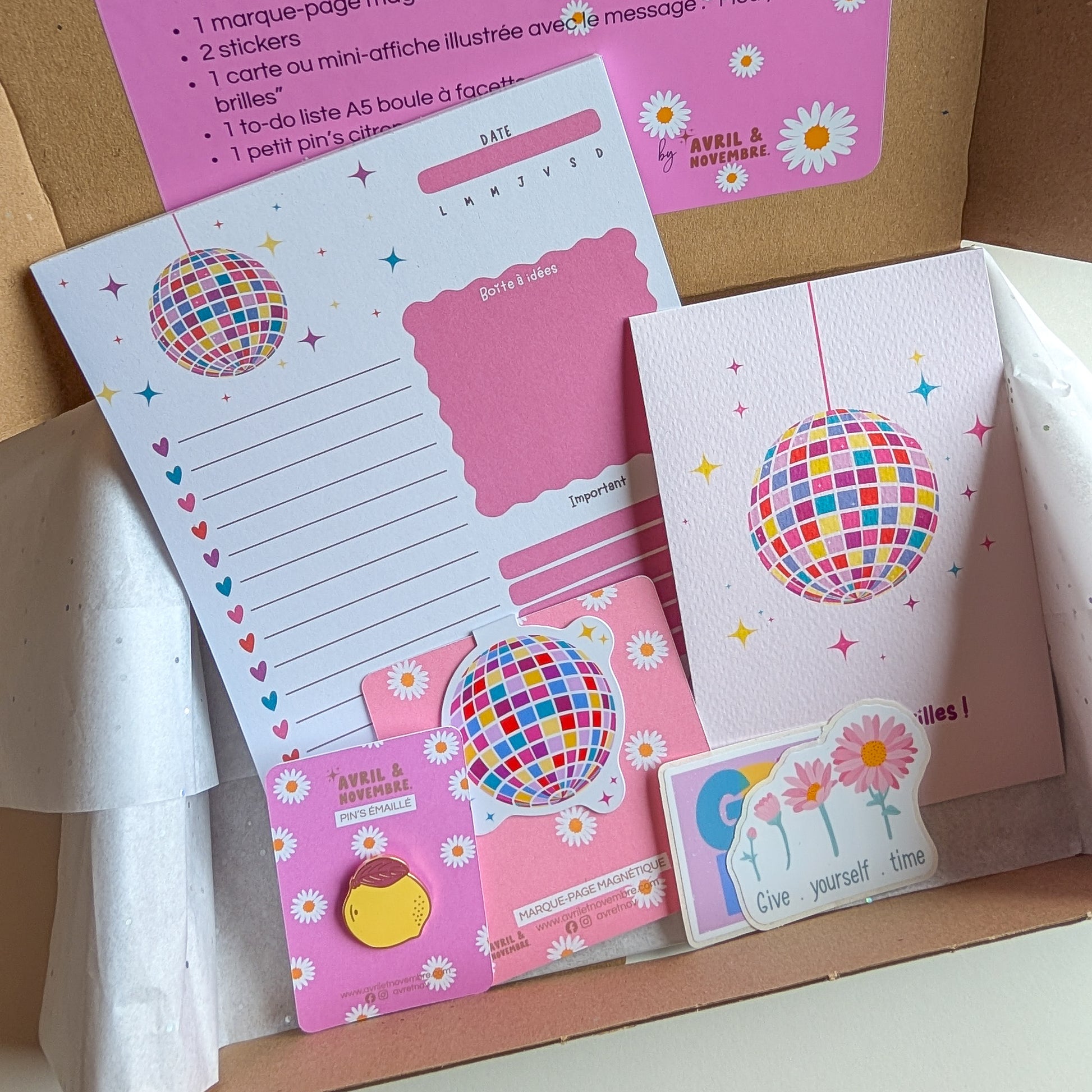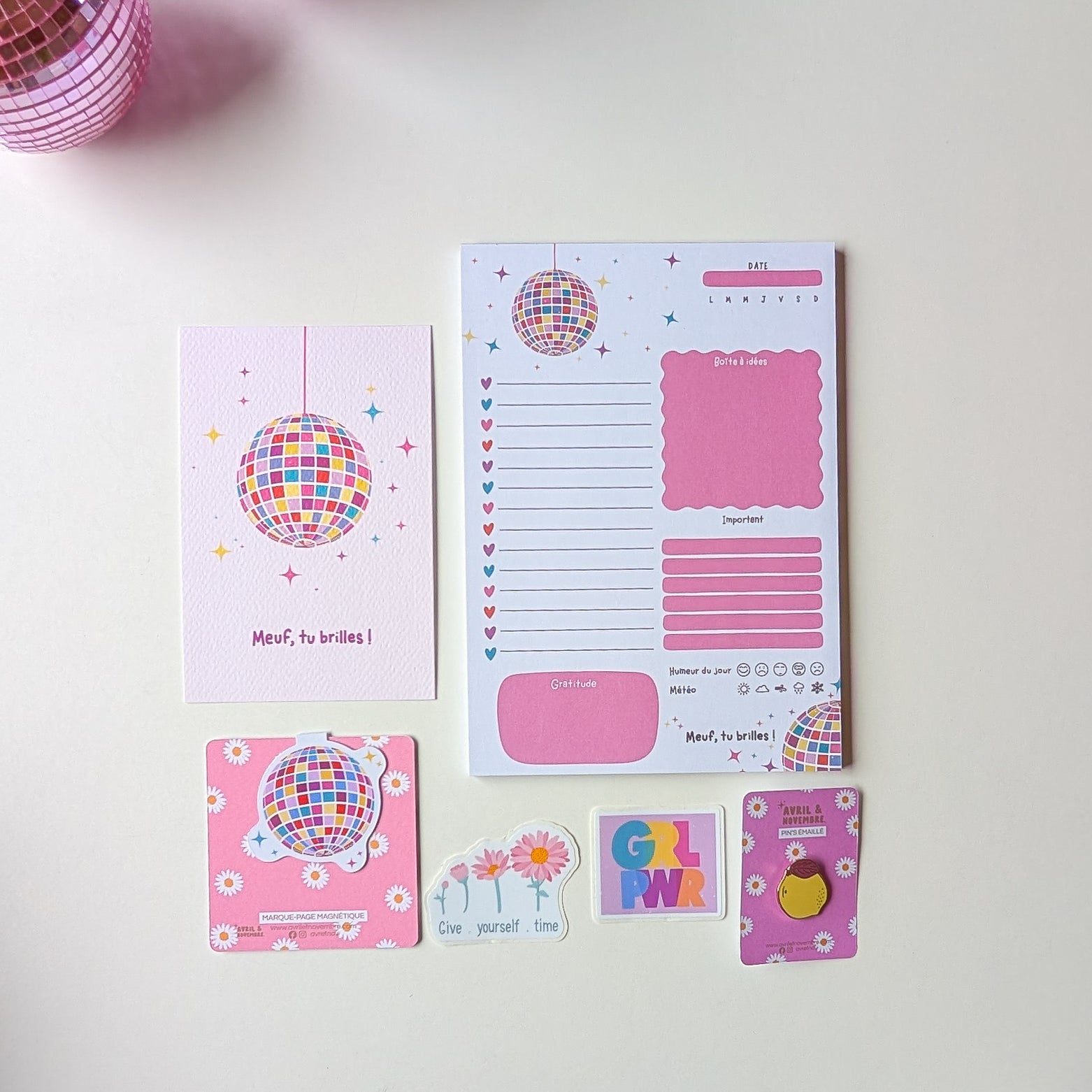 Un kit lumineux et coloré pour celles et ceux qui aiment entourer leur quotidien de good vibes. À l’intérieur : un pin’s citron, deux grands stickers, une to-do liste A5 à motif boule à facettes et une carte illustrée assortie.