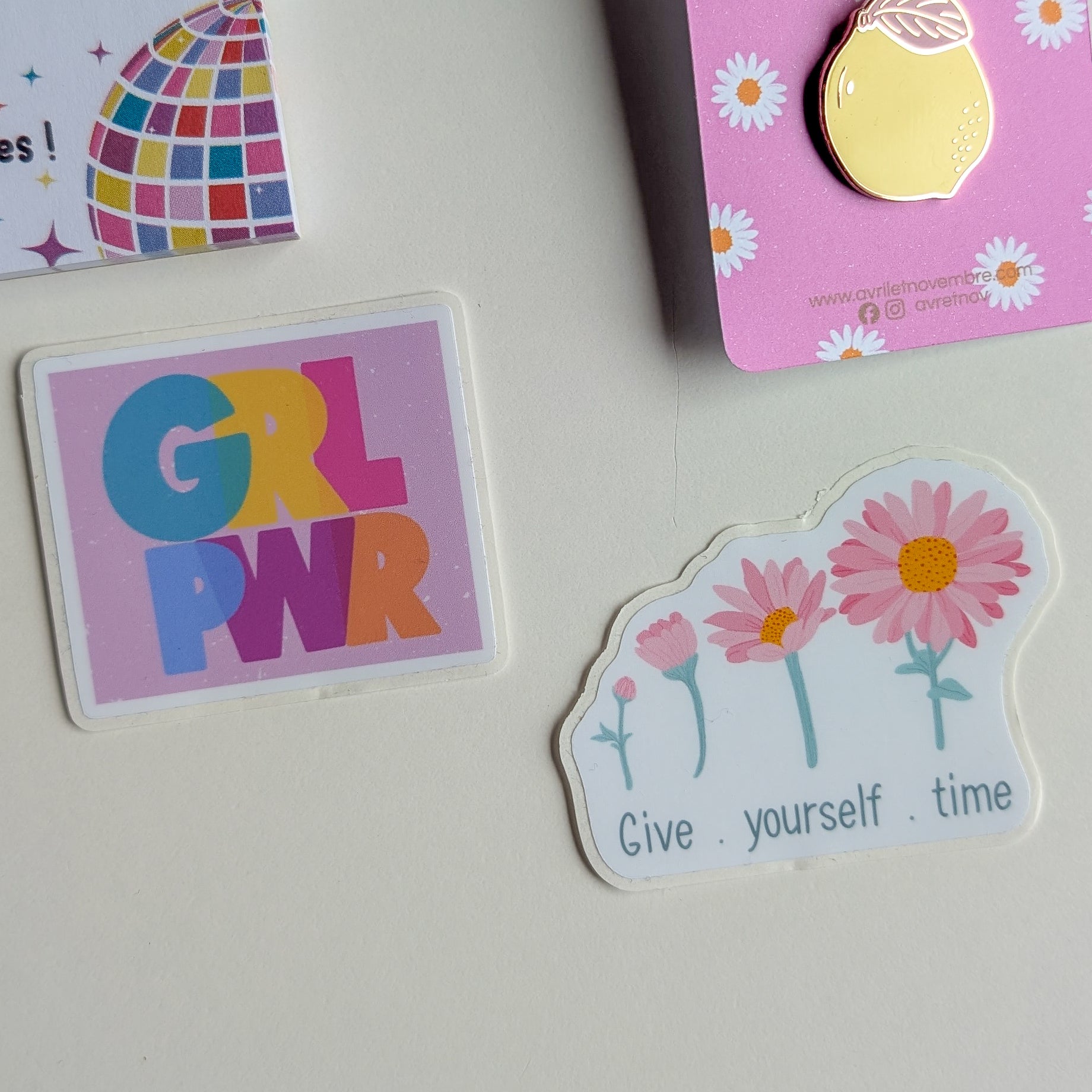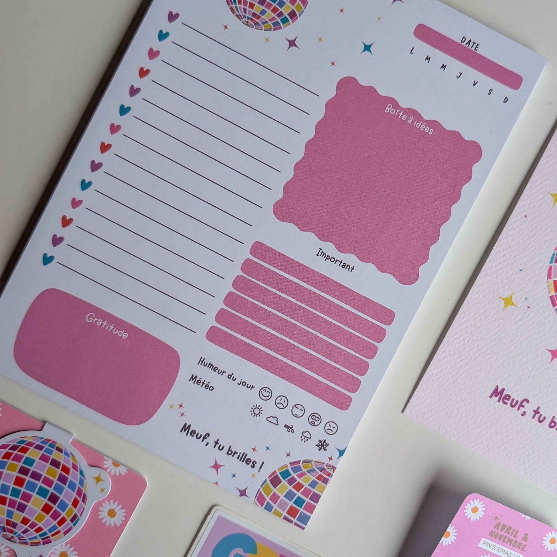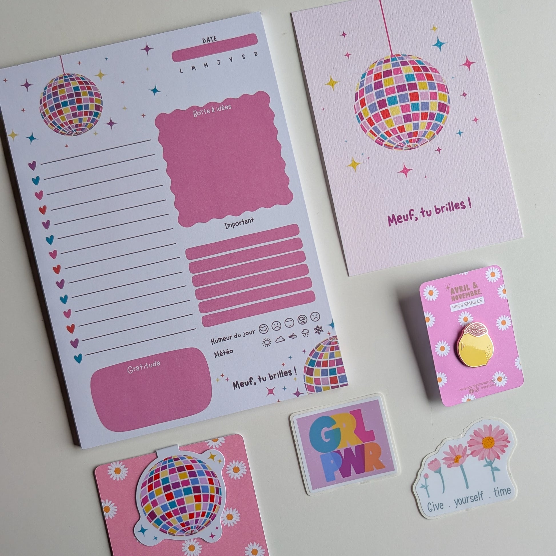 Un kit lumineux et coloré pour celles et ceux qui aiment entourer leur quotidien de good vibes. À l’intérieur : un pin’s citron, deux grands stickers, une to-do liste A5 à motif boule à facettes et une carte illustrée assortie.