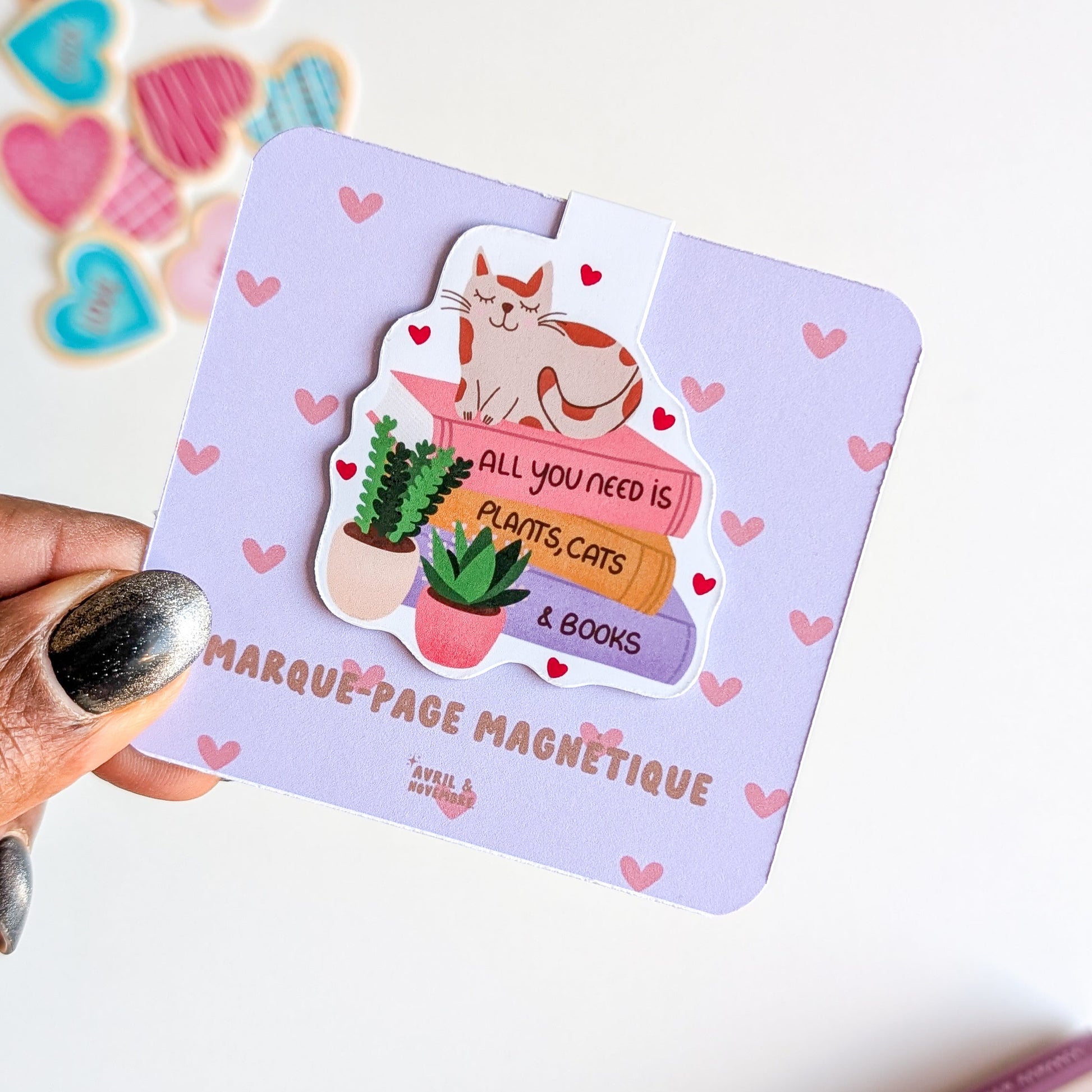 Ce marque-page illustre une pile de livres avec un chat perché au sommet et la phrase complice “All u need is plants cats and books”. Aimanté, il se fixe sans effort et garde tes pages bien en place.