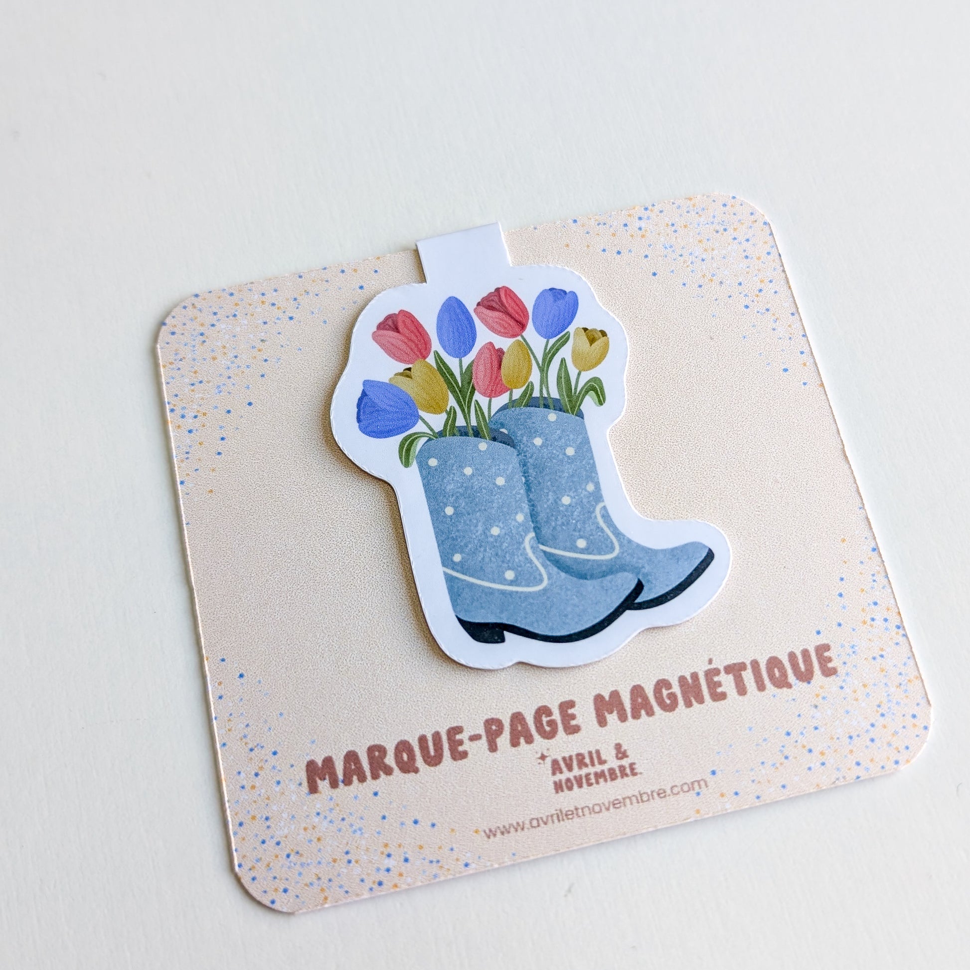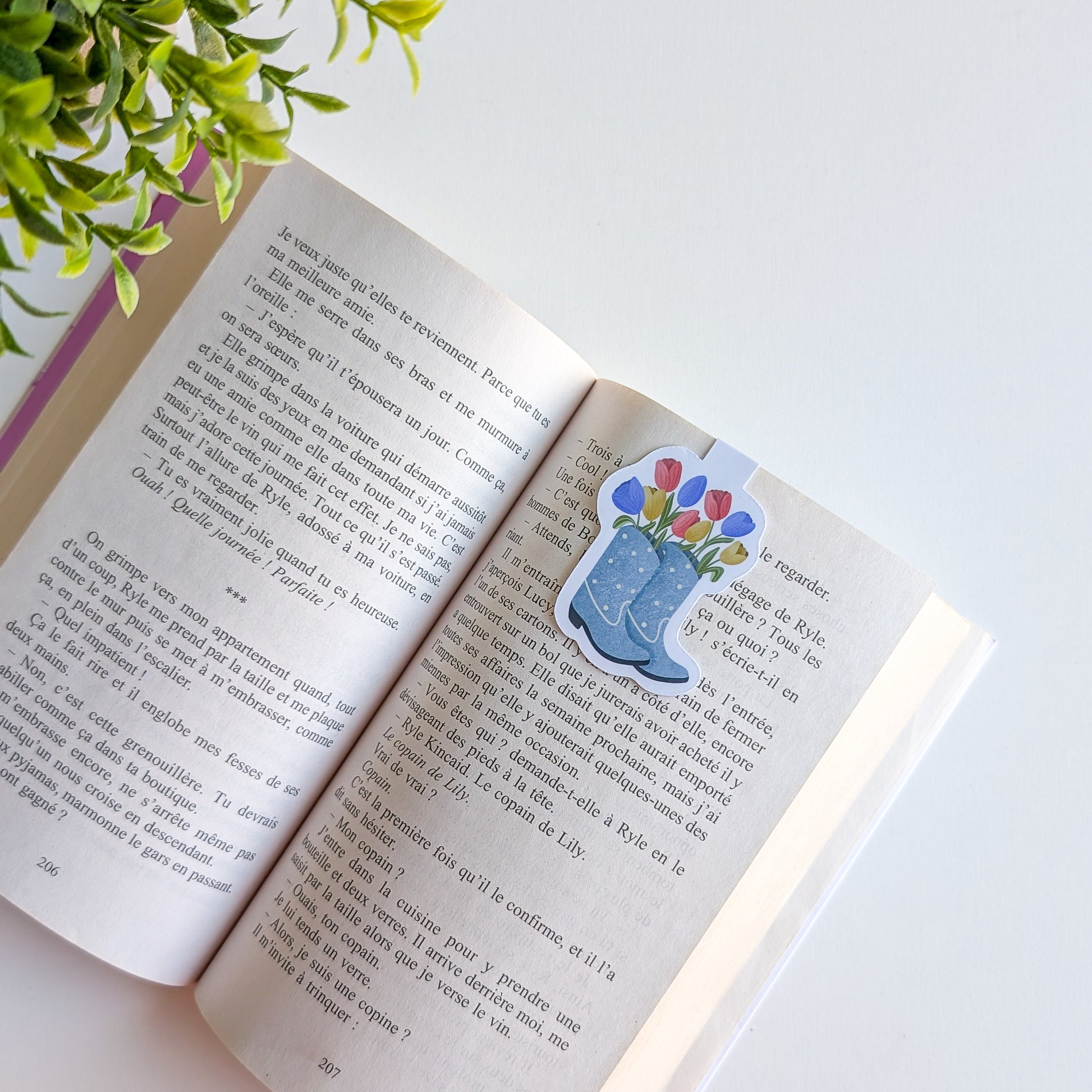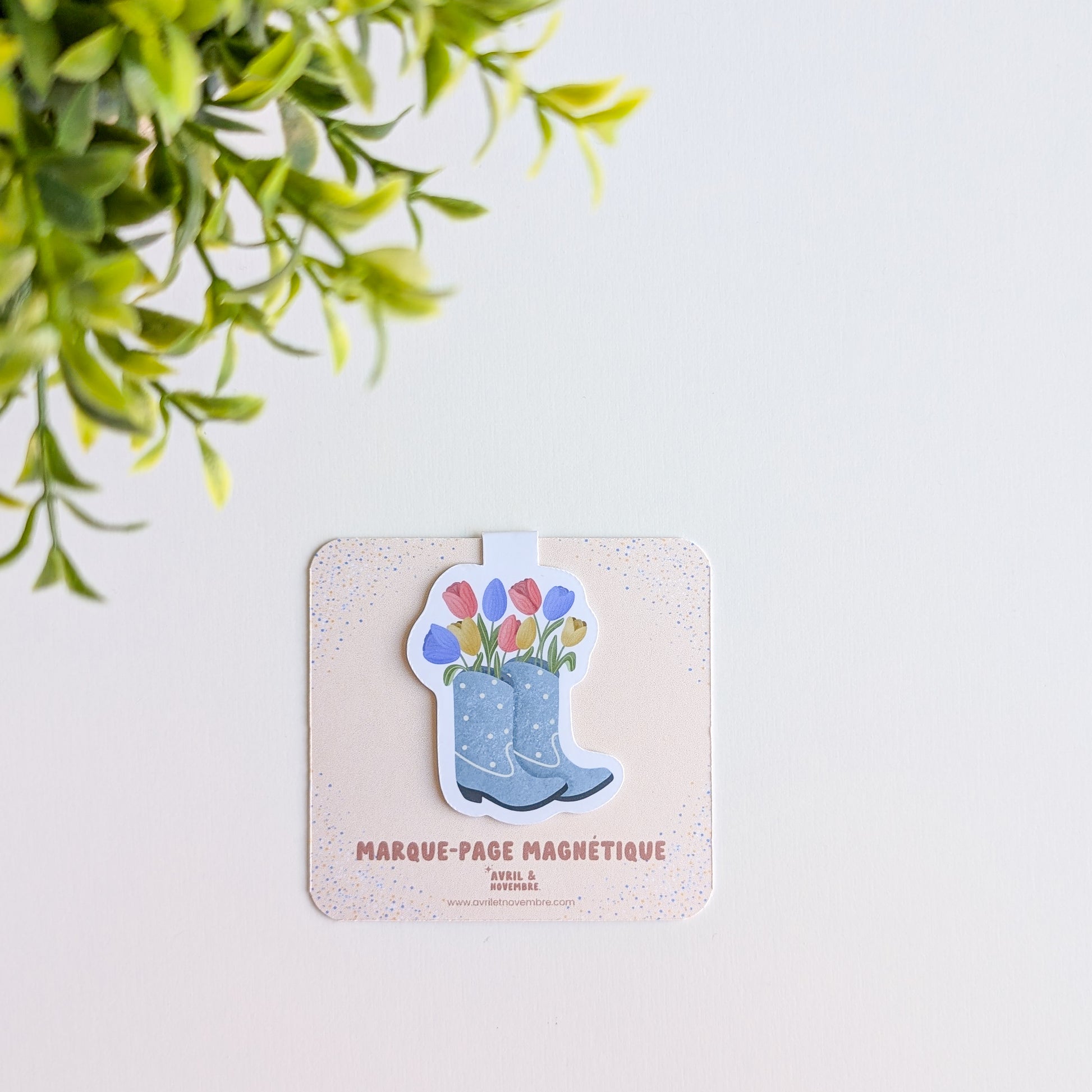 Ce marque-page magnétique illustre une paire de bottes d’où s’échappent de jolies fleurs. Original et délicat, il garde ta page en place avec style et accompagne tes lectures d’une touche champêtre et joyeuse.