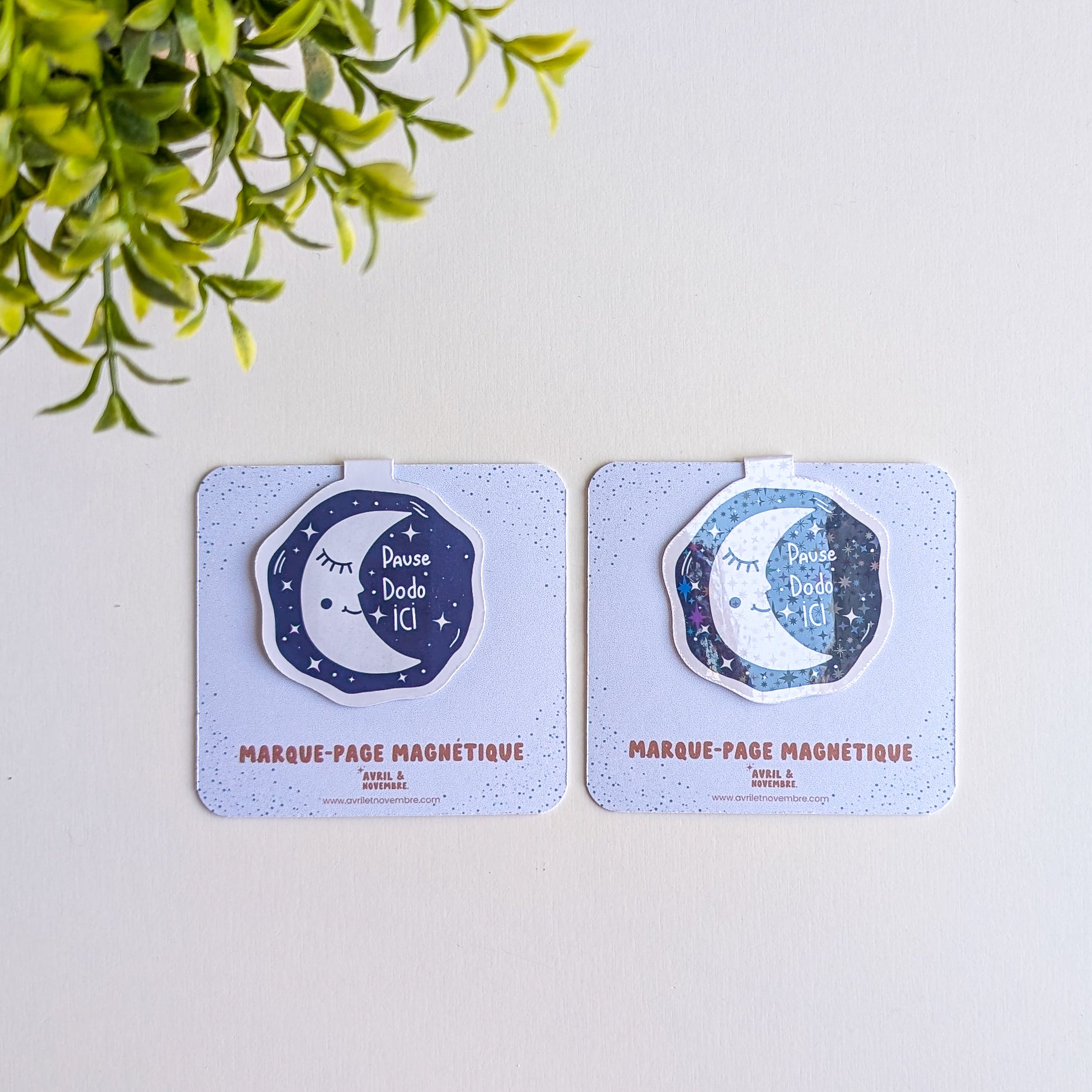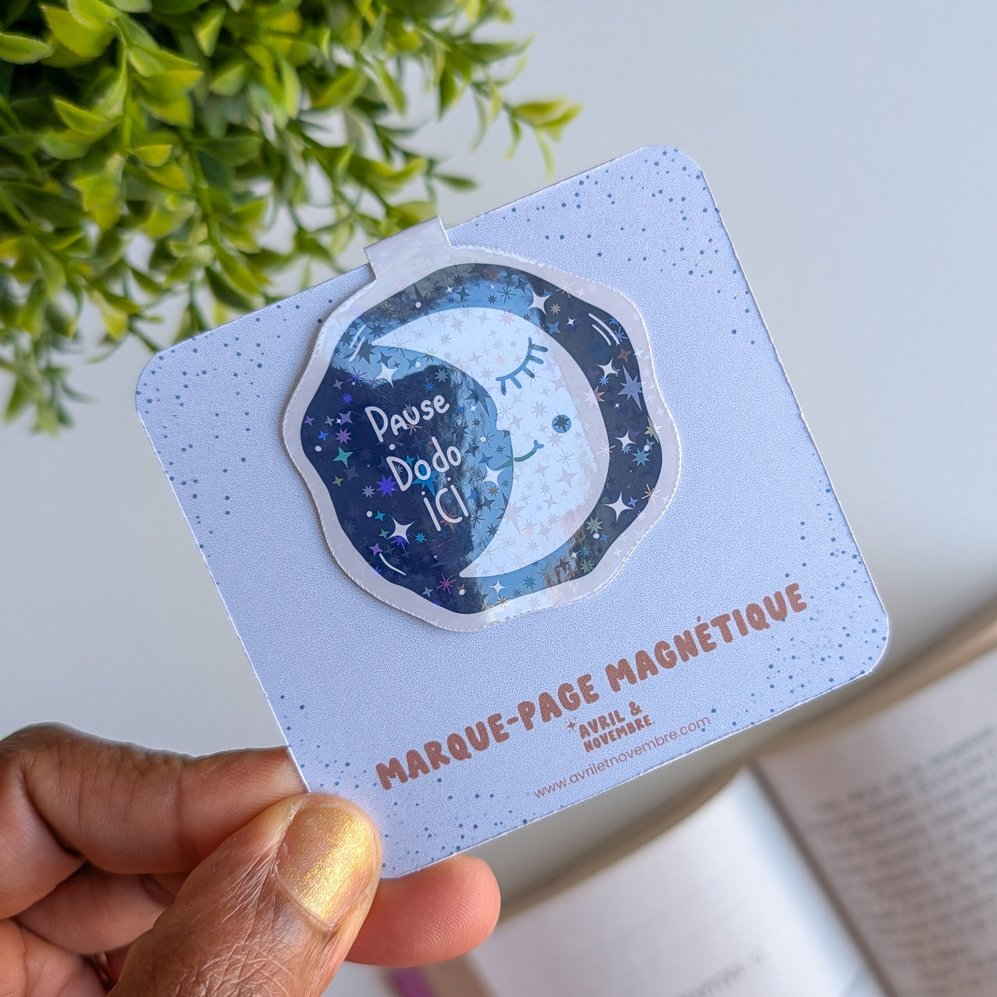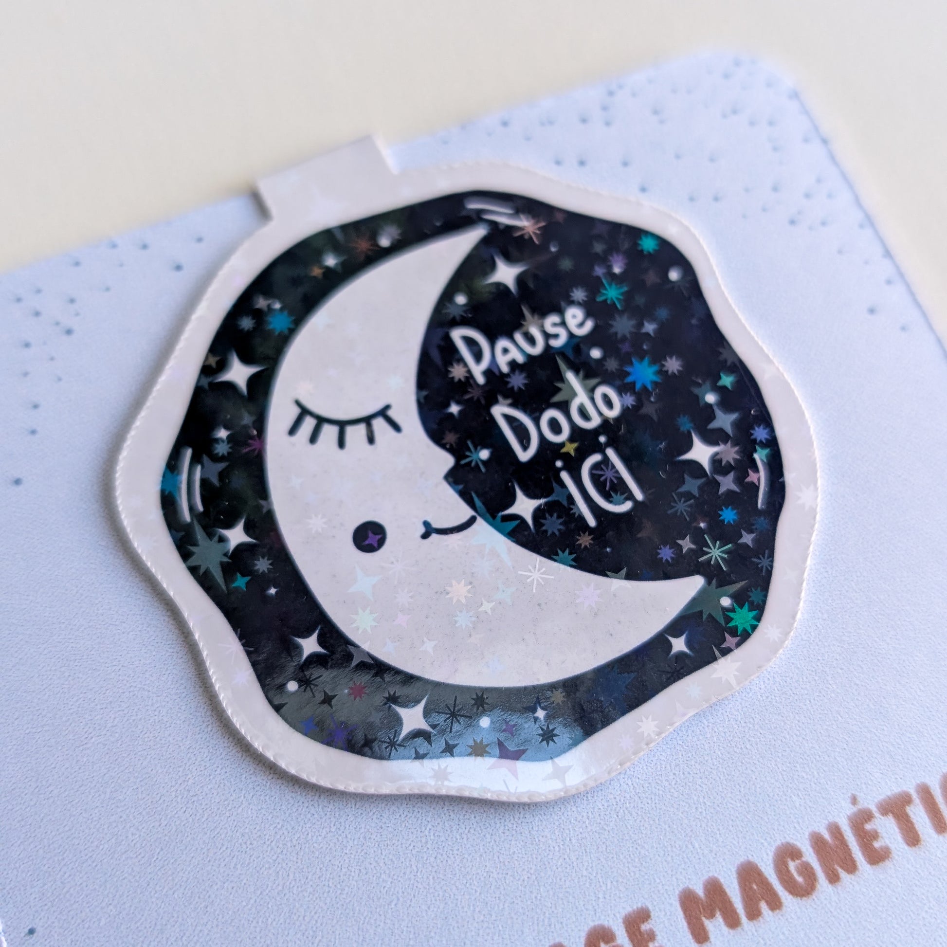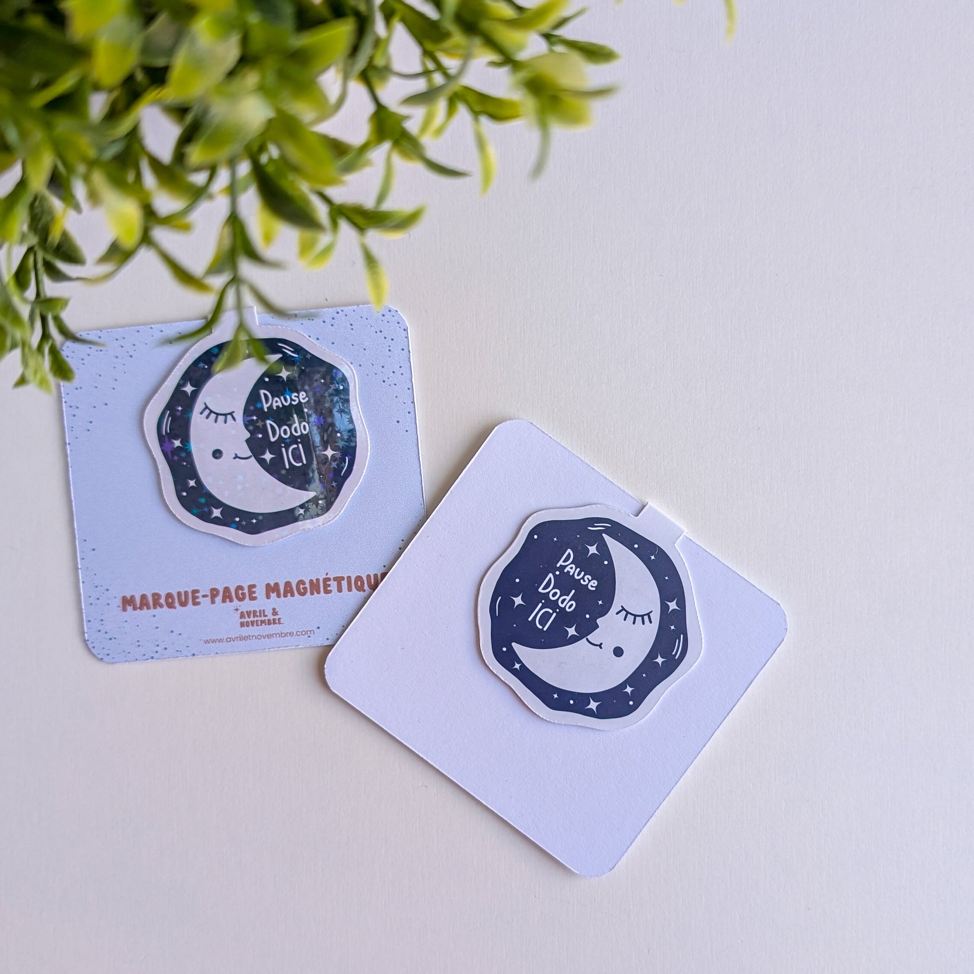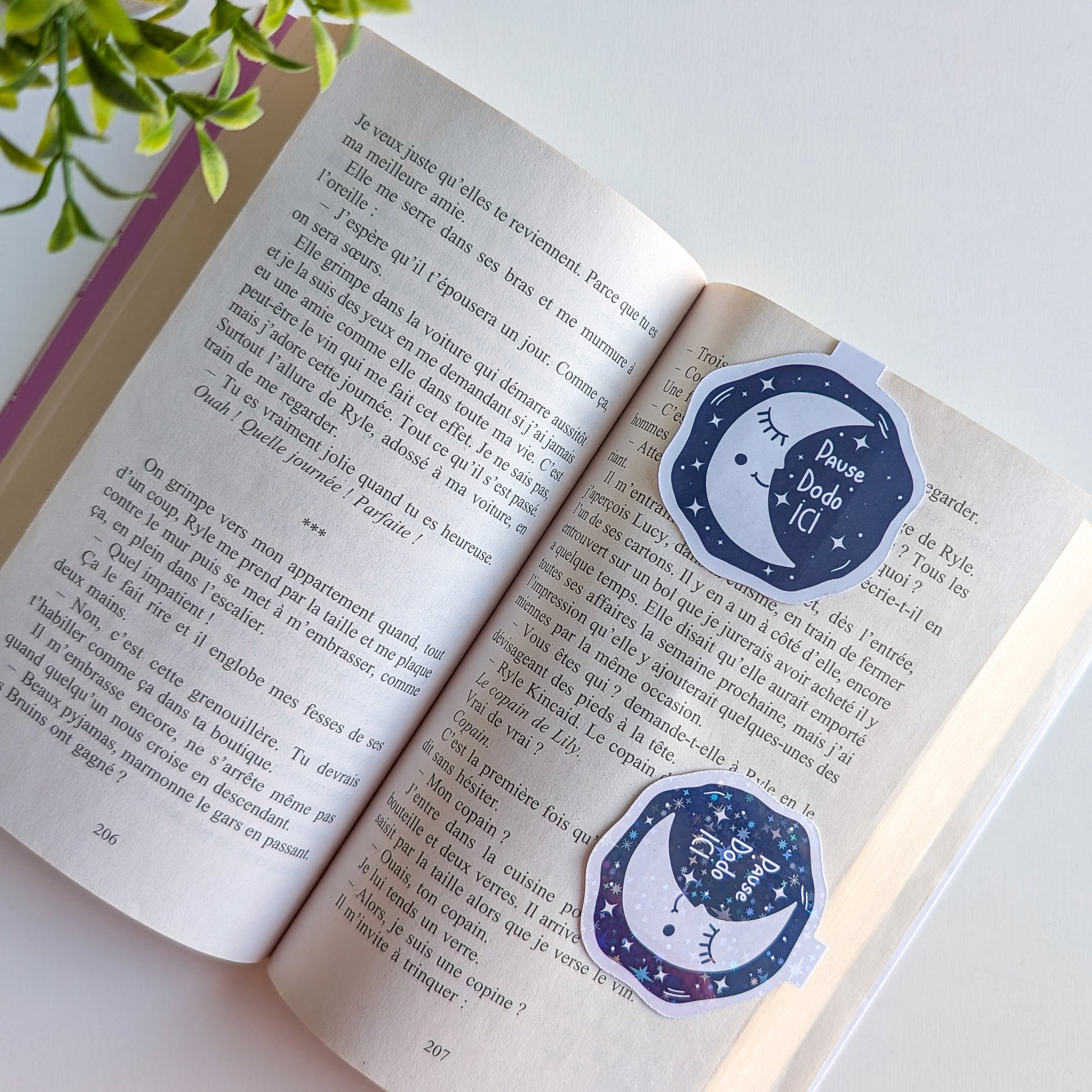 Avec son illustration de lune et d’étoiles et son message complice “Pause dodo ici”, ce marque-page magnétique est parfait pour marquer la page avant de fermer les yeux. Pratique et solide, il reste en place sans abîmer ton livre.