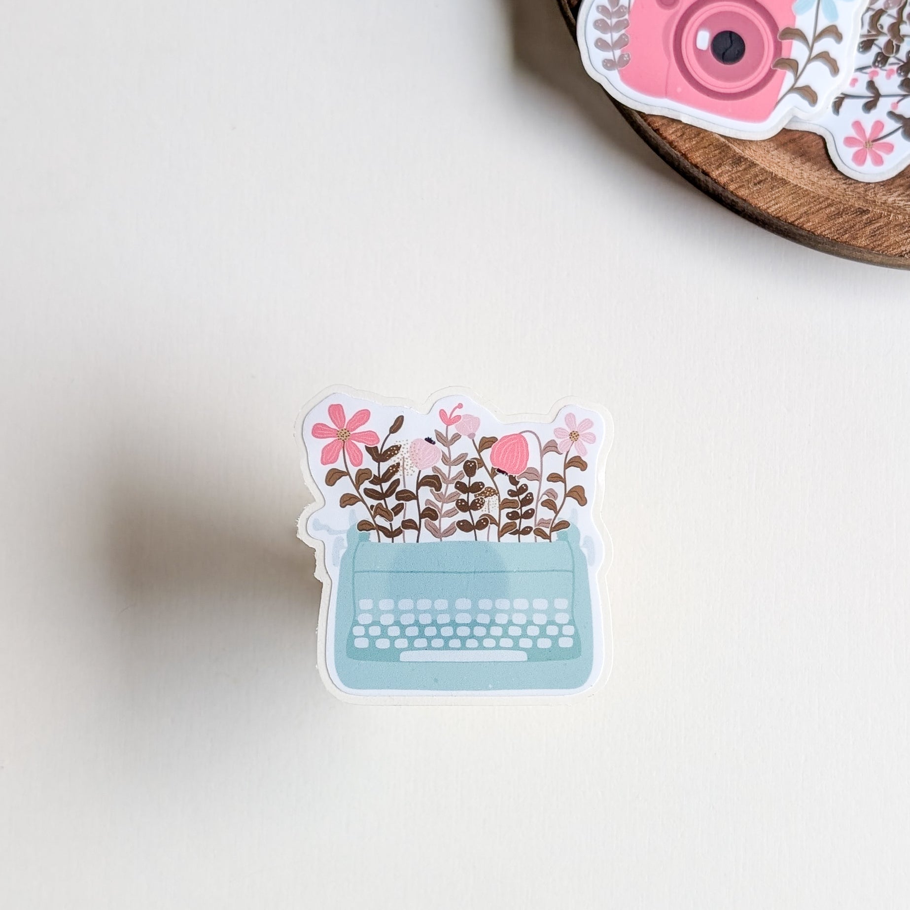 Une machine à écrire rétro d’où s’échappent des fleurs, comme une histoire qui prend vie sur le papier. Ce sticker allie inspiration et douceur, idéal pour personnaliser vos accessoires avec une touche créative.