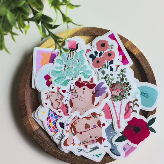 Un chat qui semble peu impressionné malgré la guirlande de cœurs qui l’entoure. Ce sticker joue sur l’humour et le contraste, parfait pour apporter une touche décalée et affectueuse à vos accessoires.