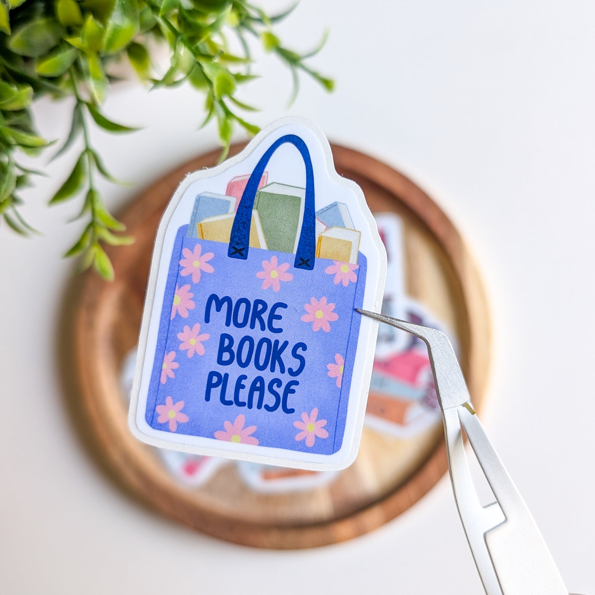 Un sac débordant de livres, accompagné du message “More books please”. Ce sticker illustre à merveille la passion des lecteurs insatiables, tout en ajoutant une touche colorée et joyeuse à vos accessoires.