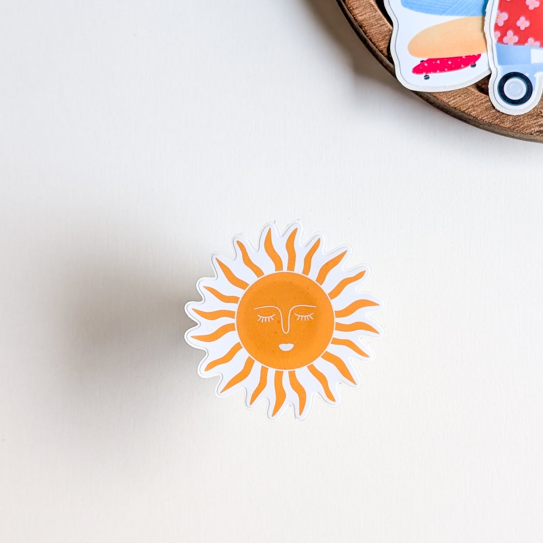 Un soleil au visage paisible, qui dégage une ambiance douce et réconfortante. Ce sticker apporte une touche rétro et apaisante à vos accessoires, comme un petit rayon de calme à emporter partout.