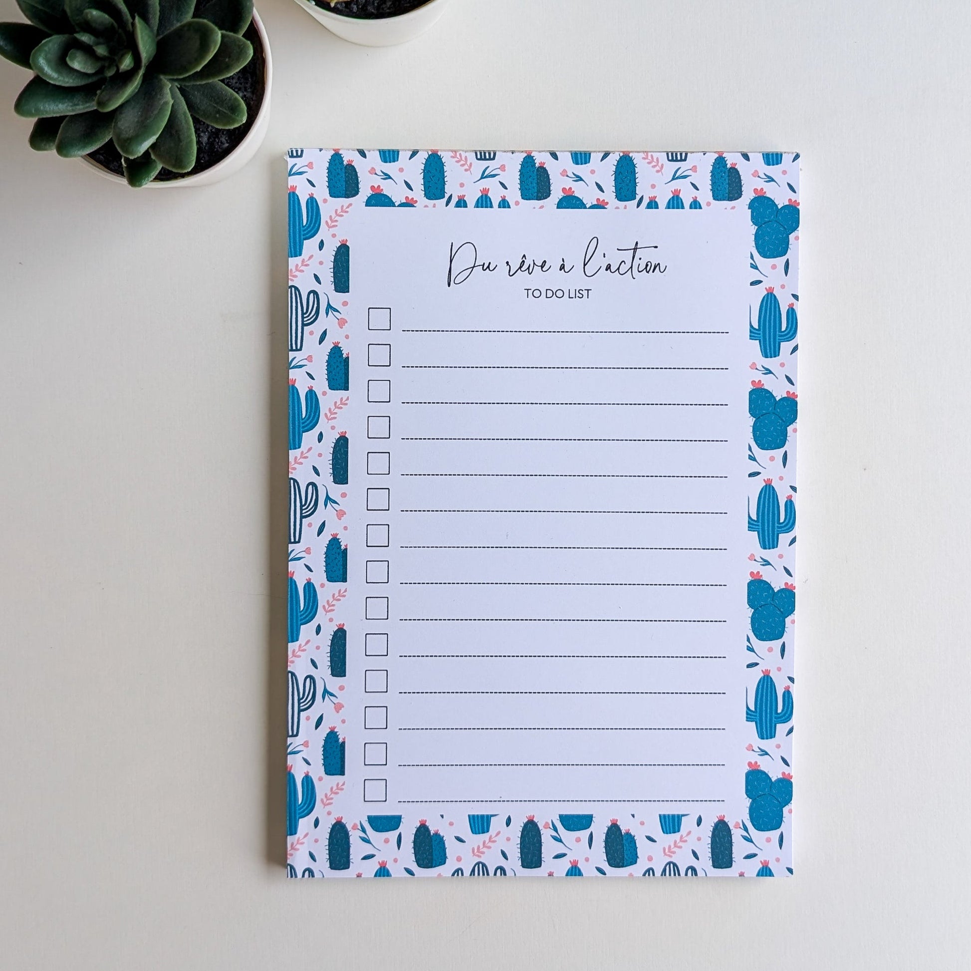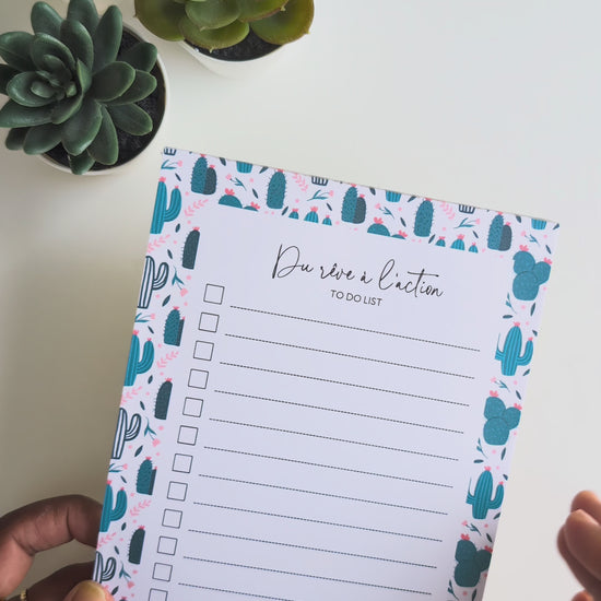 Ce modèle décoré de cactus et petites fleurs roses donne une touche fun et colorée aux listes quotidiennes. Disponible en version “To Do” ou “Du rêve à l’action”, pour écrire avec clarté ou motivation.