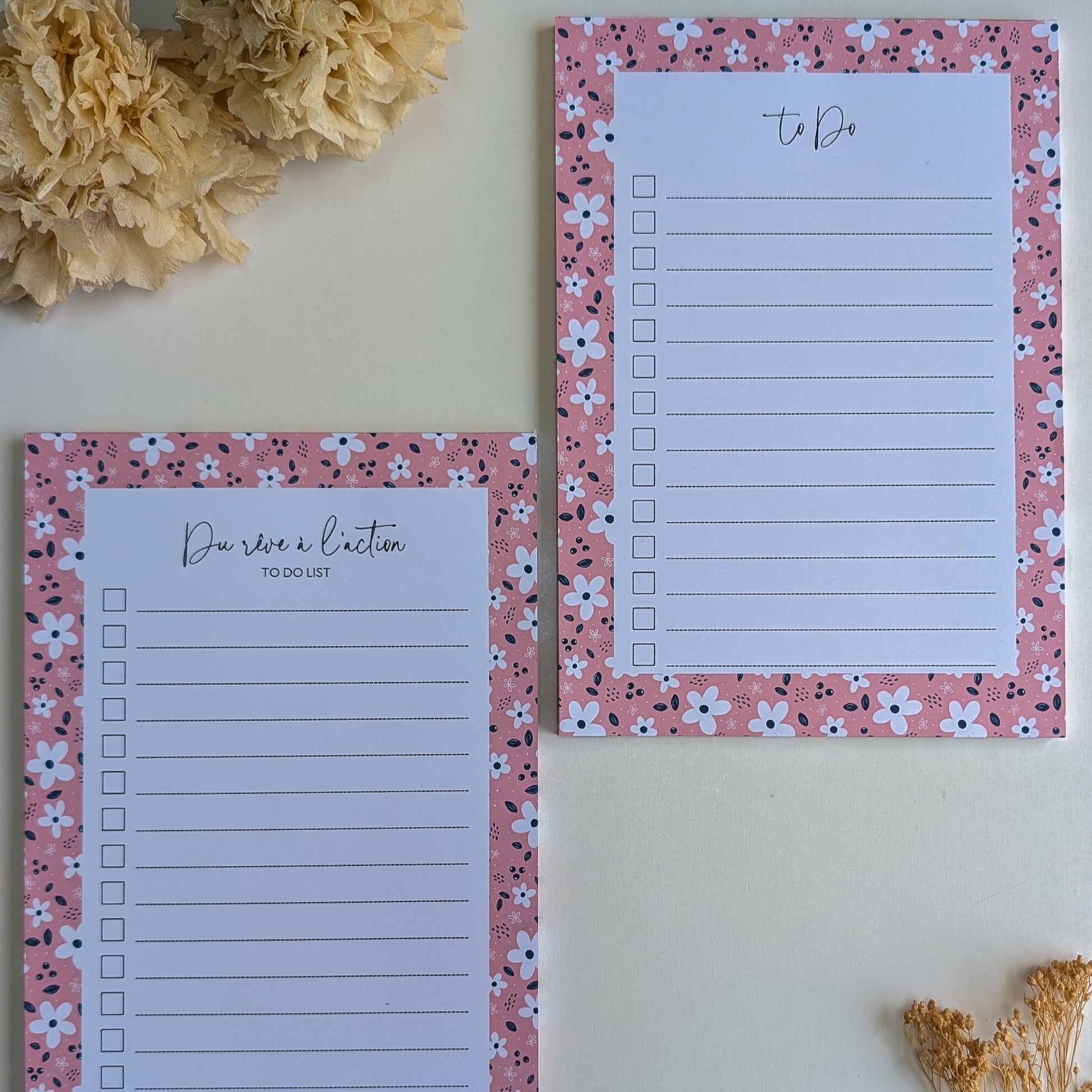 Disponible en trois coloris (rose, bleu ou violet), cette to-do liste au motif de petites fleurs blanches rend l’organisation légère et joyeuse. Avec ses 50 pages A5, elle se décline en deux versions de texte.