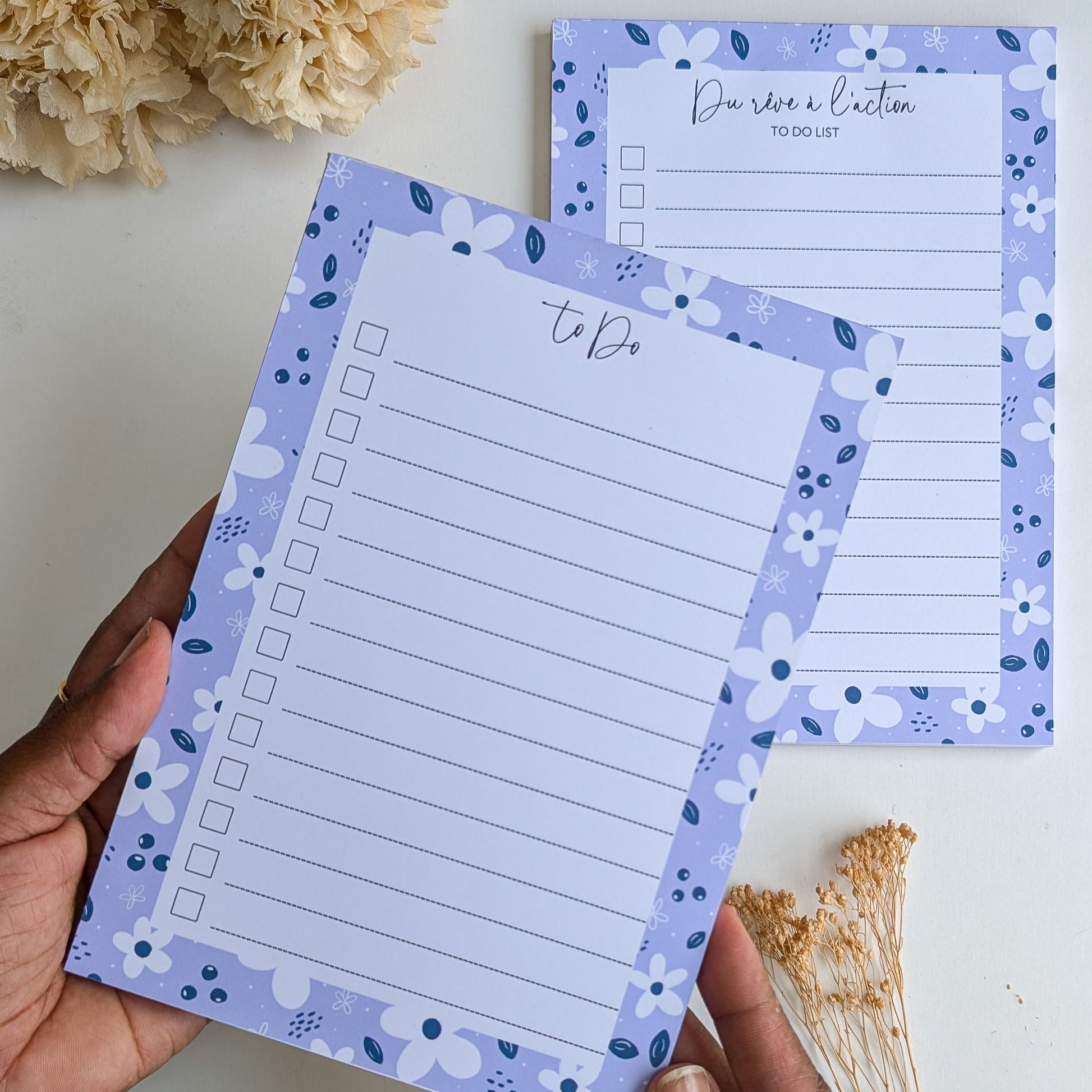 To-Do Liste A5 - Petites fleurs blanches - Fond bleu, rose ou violet